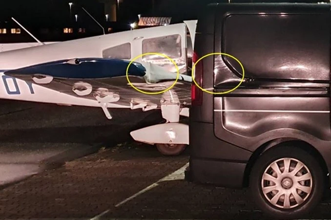 Under kørsel til bane i brug, kolliderede flyets højre vinge med en parkeret varevogn.Kollisionen indtraf i Roskilde Lufthavns hangarområde og i mørke.